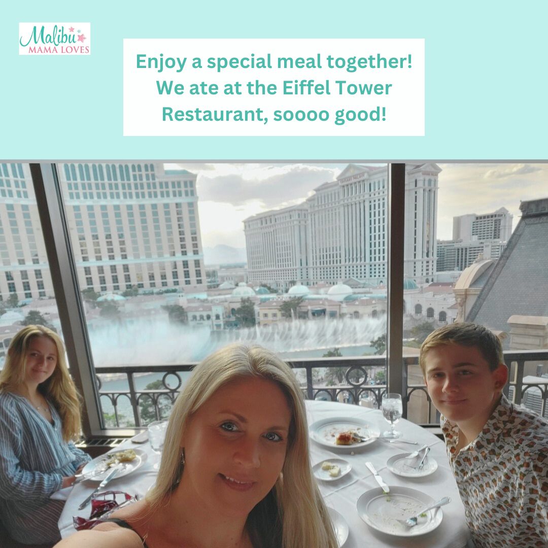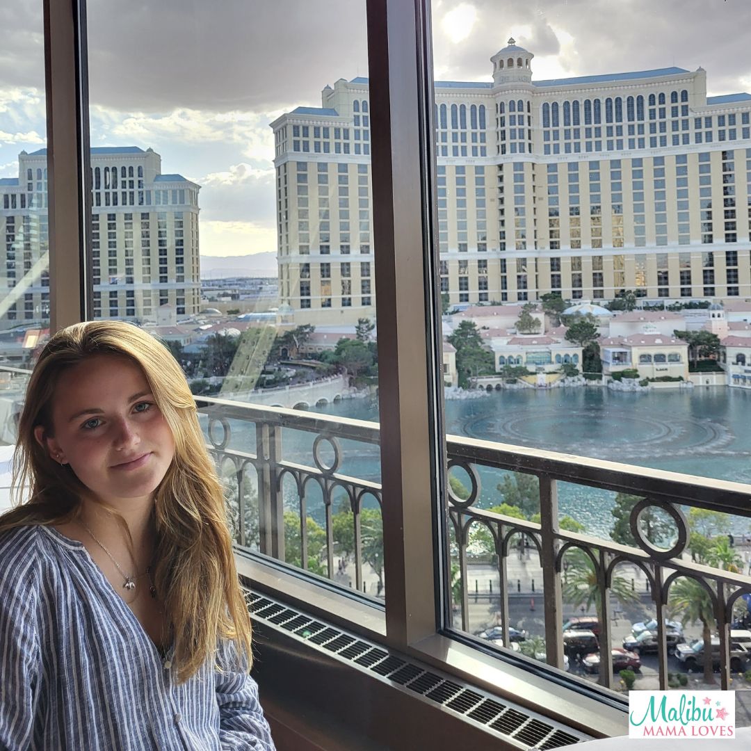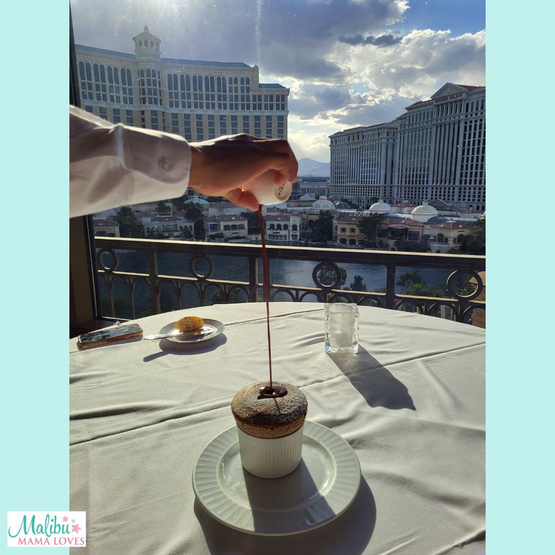 We knew we wanted to eat at the Eiffel Tower restaurant so we asked the driver to bring us to Paris! It was a quick ride. We started off with some sightseeing and shopping! The concierge there allowed us to check our carry-on bags while we shopped and dined in the hotel. There is always so much to see and do, from the shops, to the street performers, to the amazing hotel dancing fountains – we were enthralled!